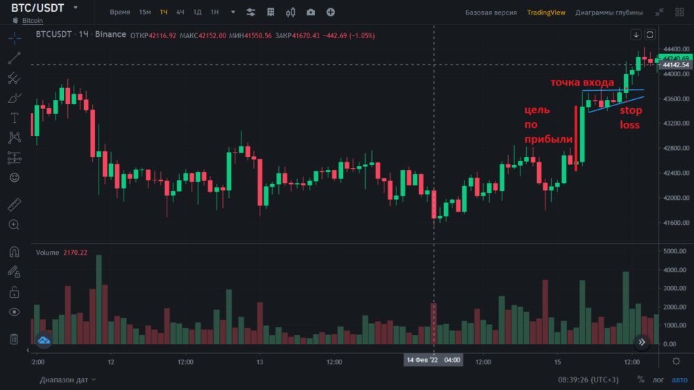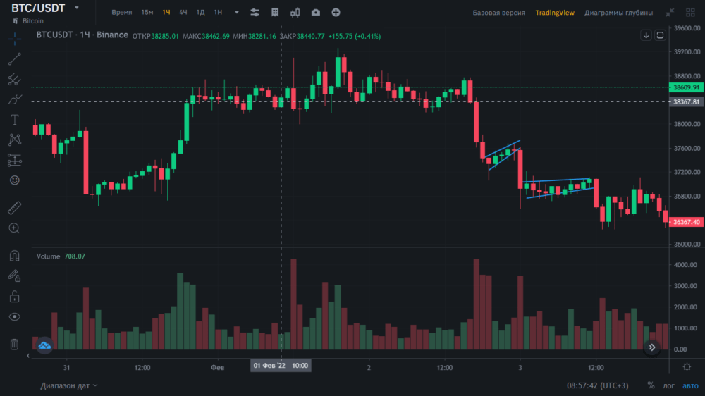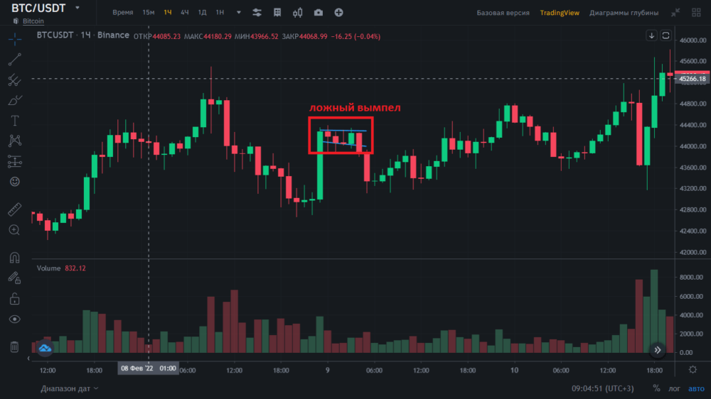 Ниже показан пример появления рассматриваемой формации на графике криптовалютной пары BTC/USDT с часовым таймфреймом.
