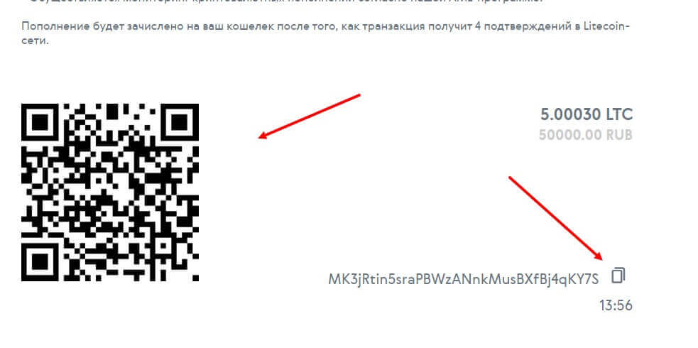 - На следующем шаге система сгенерирует уникальный криптовалютный адрес кошелька для перевода. Вам необходимо будет выполнить перевод на этот адрес из вашего текущего криптокошелька. Убедитесь, что все данные введены верно, и сумма перевода соответствует той, которую вы хотите пополнить. При пополнении с телефона можно воспользоваться “QR-кодом” – после сканирования кошелек должен указать номер кошелька автоматически.