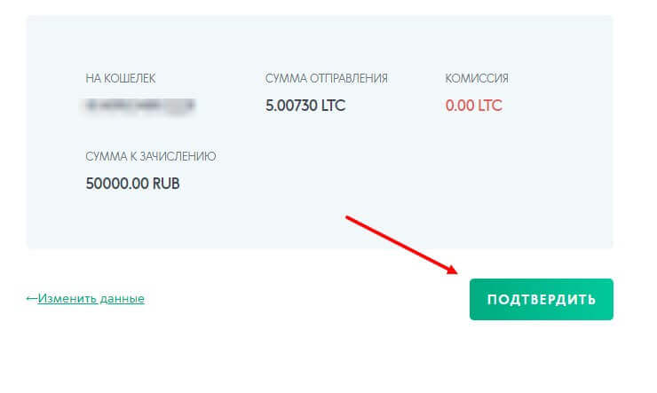 - После выбора криптовалюты, необходимо подтвердить сумму отправления, и кошелек, на который поступят средства после перевода криптовалюты. Для перехода к оплате нажмите на кнопку “Подтвердить”.