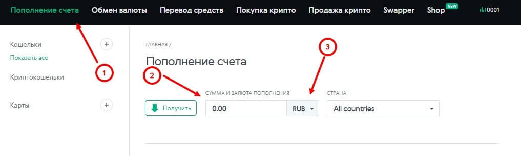 - В первую очередь, перейдите в раздел “Пополнить” и определитесь с суммой пополнения баланса и используемой валютой.