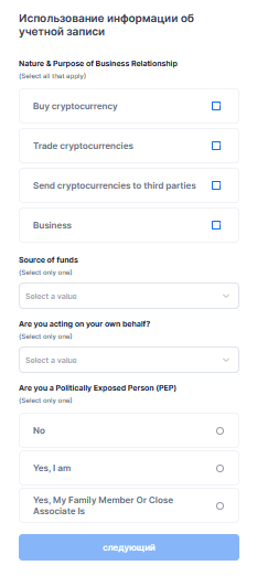 Далее заполняем стандартную анкету KYC. Здесь требуется указать информацию о планируемой финансовой активности, источнику получения средств, которыми обладает владелец криптокошелька, а также то, каким образом планируется использование платформы – самостоятельно или от имени третьих лиц. Последний вопрос – принадлежность к лицам, имеющим отношение к списку политически значимых. Положительный ответ на этот вопрос делает использование функционала невозможным.