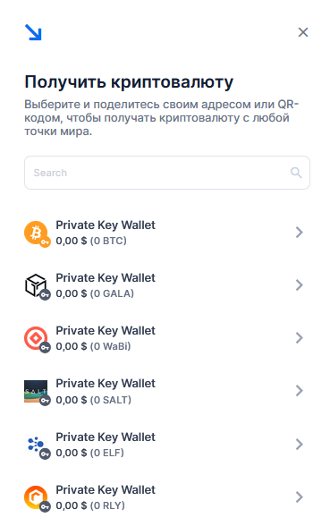 Чтобы получить сторонний перевод, необходимо иметь qr-код с адресом. Для различных валют предусмотрены отдельные приватные ключи.