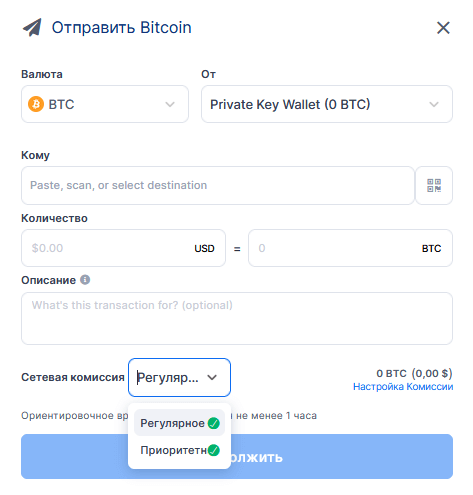 Процесс передачи имеющихся средств на другой счет предельно прост – достаточно выбрать депозит, с которого будет осуществляться списание, ввести адрес кошелька получателя, необходимое количество монет, либо сумму в долларах, а также определить приоритетность проведения перевода. При обычном приоритете взимаются только стандартные комиссии блокчейна, при выборе приоритетного типа можно настроить желаемый объем комиссии и уменьшить таким образом срок проведения транзакции.