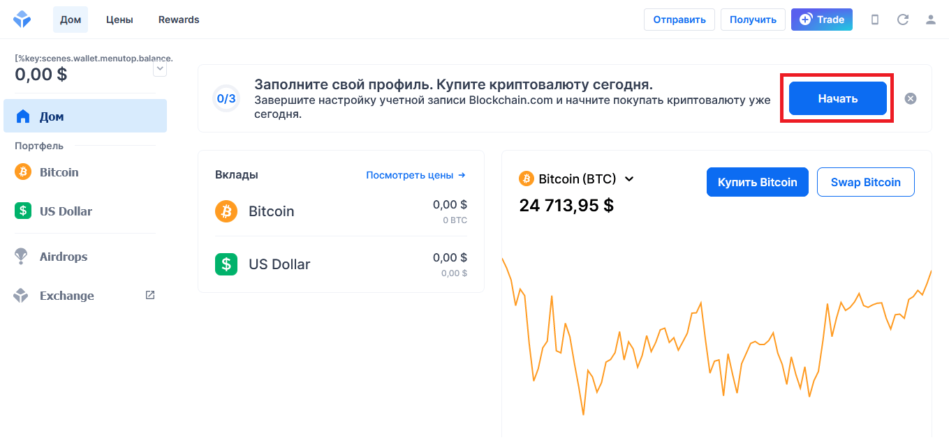 При первом входе в аккаунт будет предложено пройти верификацию, потому как пользоваться всеми основными функциями без подтверждения личности в Блокчейн нельзя. Для доступа к торговому функционалу платформа предложит заполнить персональные данные.