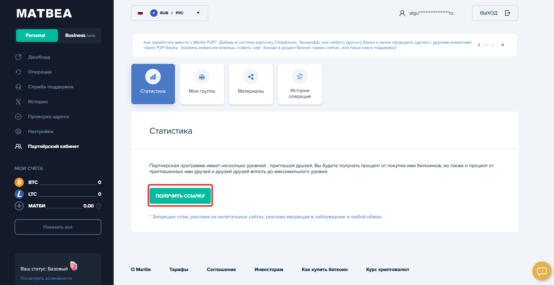 Участие в сети P2P и заработок на арбитраже – не единственный способ заработка в Матби. Получать партнерские отчисления можно приглашая других к участию в платформе. Каждый партнер получает определенный процент от произведенных его рефералами покупок Биткоинов, причем глубина реферального дерева ничем не ограничена.