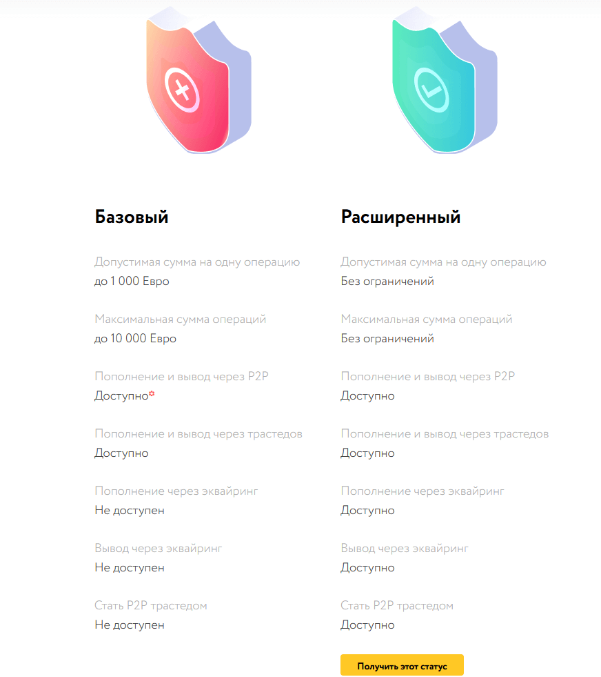 - Базовый. Ограничивает объем одного перевода в 1000 евро при максимальном объеме в 10 000 евро. Взаимодействие с другими участниками возможно только если вторая сторона допускает привлечение неавторизованных владельцев аккаунтов. Невозможно пополнить баланс и списать деньги через эквайринг, к которому в том числе относятся и пластиковые карты.