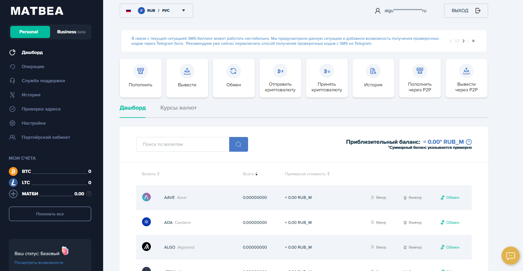 В обоих случаях для создания кошелька достаточно ввести выбранный контактный способ и придумать надежный пароль для защиты счета. После подтверждения полученного от площадки сообщения, новоиспеченный владелец криптокошелька попадает в главное окно личного кабинета на русском.