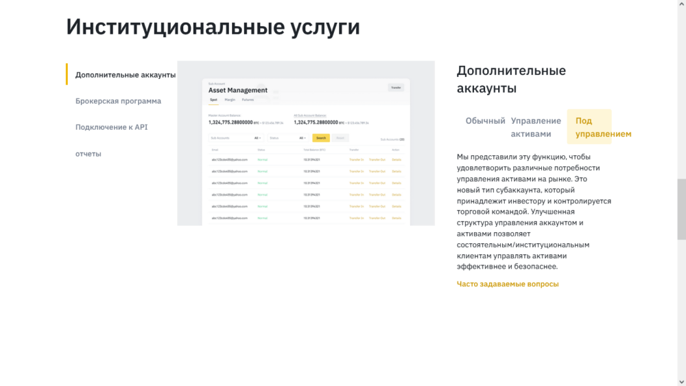 На сайте Бинанс, одной из крупнейших криптовалютных бирж современности, работа возможна через api и отдельный вид субсчета – аккаунты для управляющих.