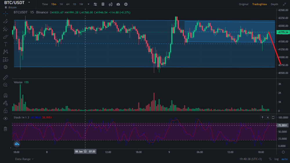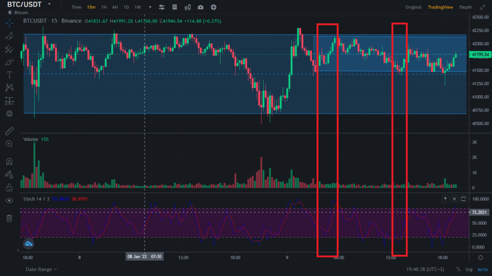 Главное, что нужно усвоить – многие технические индикаторы работают исключительно в трендовых ситуациях, а в случае с консолидированием бесполезны и даже вредны. Однако некоторые осцилляторы дают весьма полезные сигналы. Ниже представлен график рассмотренного ранее BTC/USDT на 15-минутном таймфрейме с 14-периодным Стохастиком. Можно увидеть, что во многих случаях попадание в зоны перекуплености и перепроданности дает верные сигналы. Но нередки и ложные моменты, что особенно явно проявляется на «коротком» канале (самые существенные случаи выделены).
