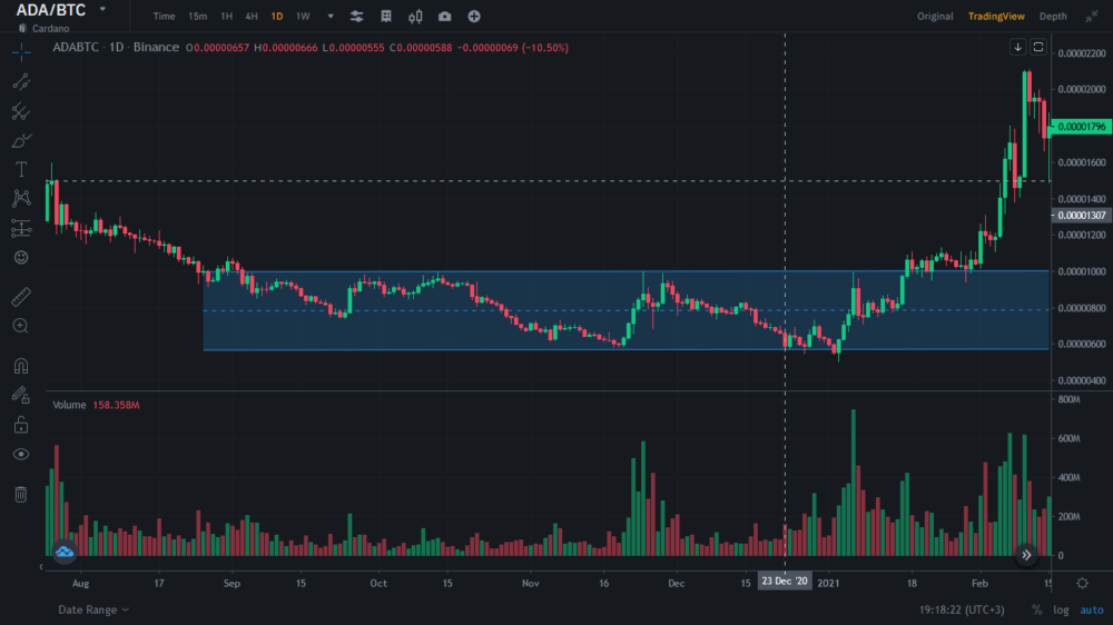 Чем больше касаний сделал график перед осуществлением пробоя, тем быстрее будут развиваться обстоятельства после закрепления за пределами границ. Ниже представлен часовой график ADA/BTC, когда котировки находились в диапазоне с августа 2020 года по февраль 2021 и только потом произошел мощный пробой и тренд устремился вверх. Тому были не только технические, но и фундаментальные предпосылки, однако ситуация с выходом из сформированного эшелона показательна, тем более, что перед его осуществлением происходило ярко выраженное сужение. Рекомендуется изучать на графиках подобные паттерны для получения опыта в идентификации схожих ситуаций на любых активах, потому что вне зависимости от волатильности и других индивидуальных факторов даже у разрозненных биржевых инструментов проявляются схожие модели поведения.