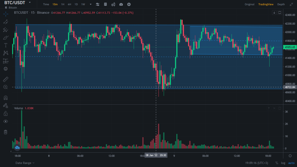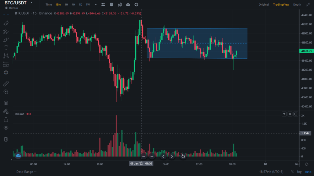 Ниже показан пример для криптовалют на краткосрочном 15-минутном таймфрейме – в канале оказалась пара BTC/USDT.