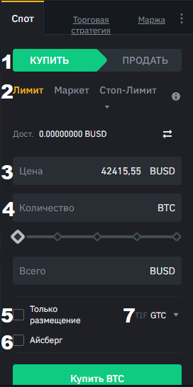 - Определиться с торговым ордером. Далее рассматриваются все возможные опции для лимитного вида. Допускается торговать с рыночными или стоп-лимитными сделками, которые рассмотрим далее.
