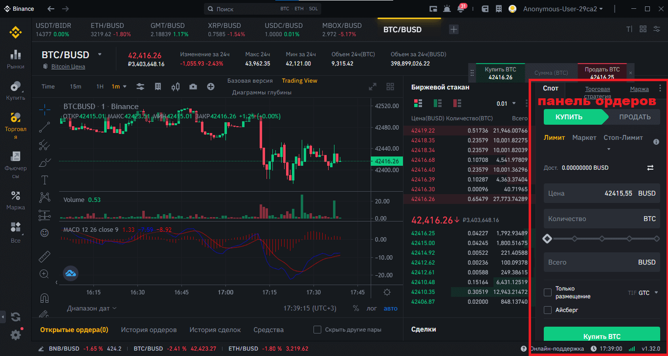 Панель управления сделками в случае с Binance располагается в правой части основного окна.