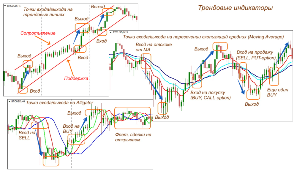 Моменты пересечения указывают на разворот тренда, точки входа на следующей свече, выход при появлении противоположного сигнала или явном развороте. На сильных трендах дополнительно можно войти на отскоке от MA, как показано на рисунке.