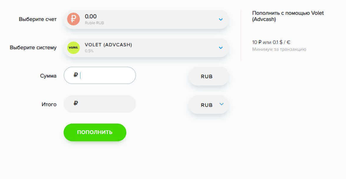 - Зарегистрироваться на сайте и пополните счет, выбрав рублевый счет, систему для пополнения и сумму.
