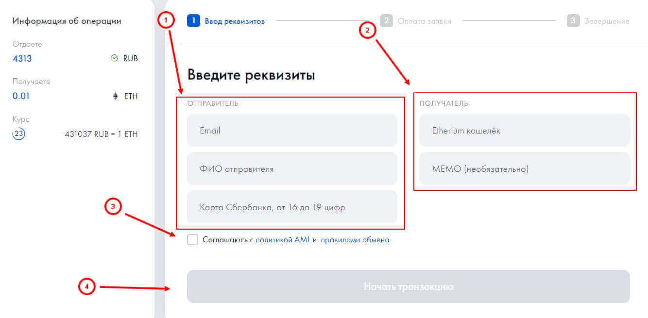 - Выберите способ оплаты заявки, а в разделе “получаете” выберите Ethereum (ETH). Затем укажите сумму, которую готовы заплатить – дополнительные комиссии платить не надо, так как все издержки уже заложен в конечный курс.