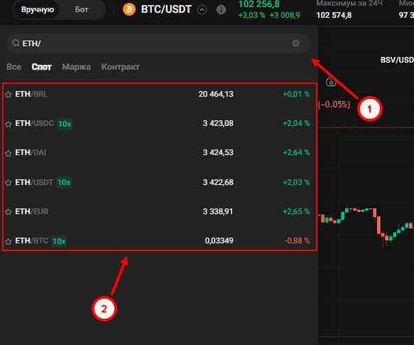 В поиске укажите ETH и выберите торговую пару ETH/USDT или другие (в зависимости от актива, которым вы располагаете). Купить эфир можно на сайте KuCoin можно с помощью BRL (бразильский реал), Tether USD (USDT), USD Coin (USDC), DAI, EUR (евро) или BTC (Биткойн).