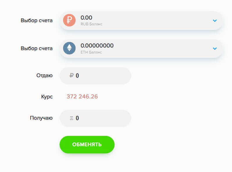 - Затем нужно перейти в раздел “обменять”, выбрать рублевый счет и во второй вкладке токен ETH. Укажите сумму в разделе “отдаю”, проверьте сумму во вкладке “получаю” и нажмите “обменять”. Во вкладке “курс” указана цена в рублях.