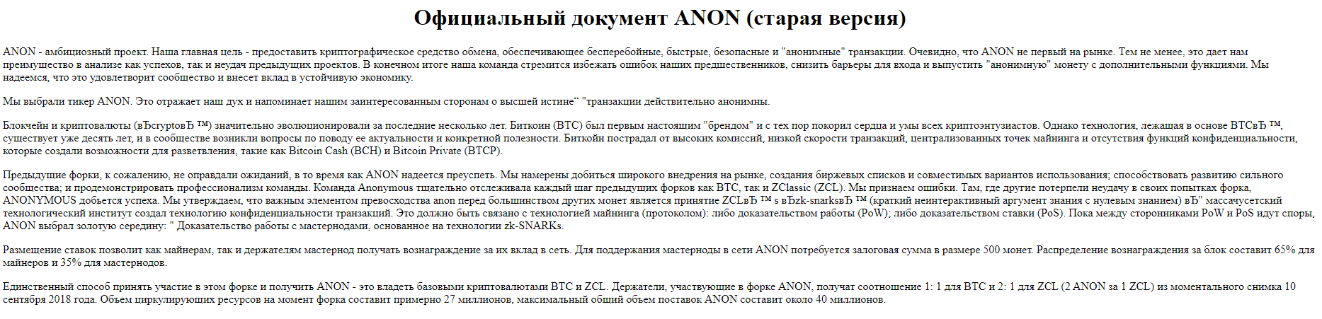 Судить об особенных характеристиках нового блокчейна принято, исходя из описания его «дорожной карты» (whitepaper). И в случае с ANON речь идет об одном из наиболее кратких документов в криптосреде. Ниже представлен актуальный скриншот с официального сайта. Первое, что бросается в глаза – отсылка к «старой версии» документа. Новой редакции найти не удалось, это говорит о том, что разработка над токеном, возможно, прекратилась, либо находится в стадии заморозки.