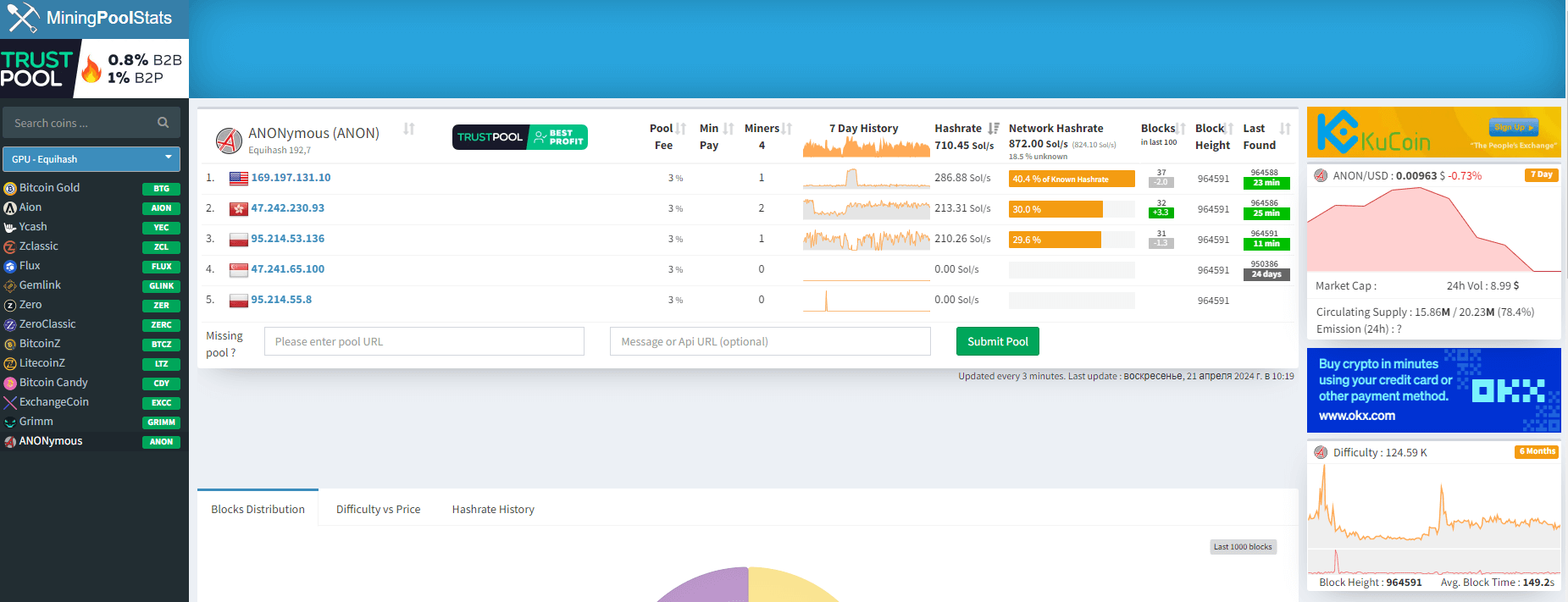 - Доступный объем монет для участия в работе мастернода. По представленным условиям, обладая суммой в 500 монет, каждый желающий смог стать либо майнером, либо администратором онлайн мастернода. Вознаграждение для первых должно составлять 65% от планируемой награды за вычисление нового блока, и оставшиеся 35% для вторых. Однако ввиду низкой востребованности проекта, майнинг токенов остается исключительно занятием на уровне личного энтузиазма. Ниже представлена статистика по майнинг-пулам платформы, исходя из которой можно говорить о крайне низкой активности участников, опираясь на количество доступных пулов и их загруженности.
