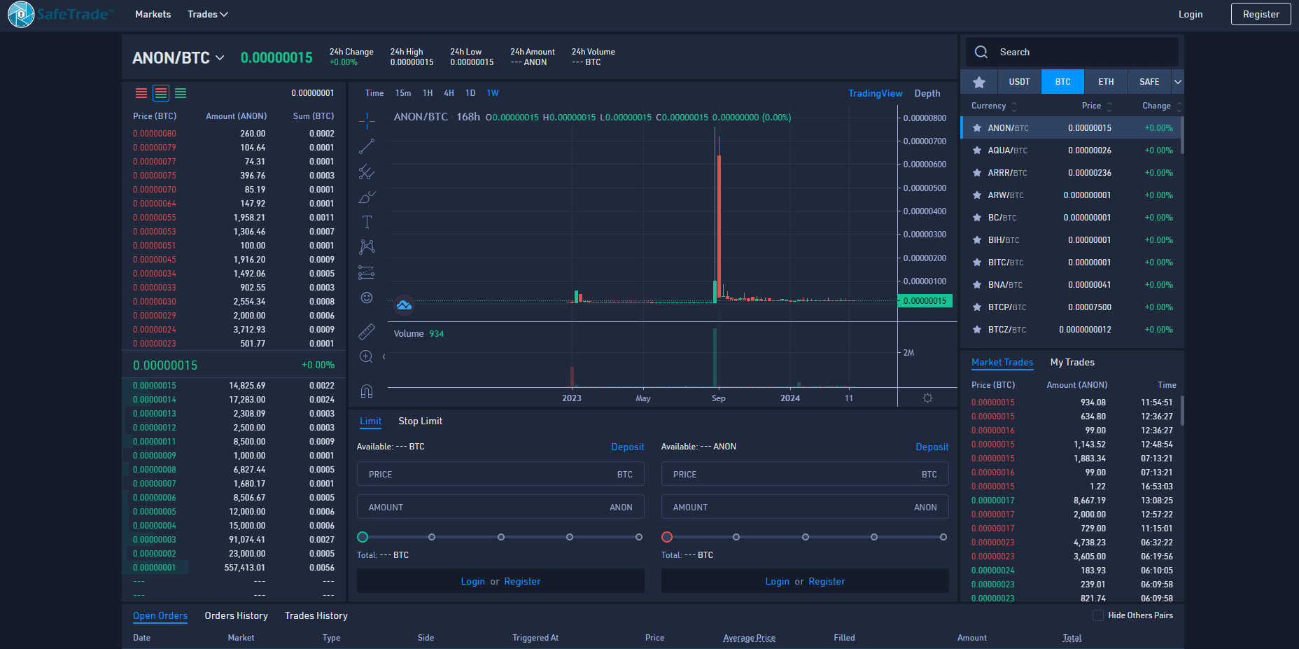 На начало второго квартала 2024 года не наблюдалось какого-то существенного роста цены (при этом даже на CoinMArketCap, собирающей информацию со всех мировых платформ, не рассчитан индекс цен и на дату выхода материала не отображалась цена в рублях или любых других валютах). А в числе поддерживающих на сегодня работу с данными криптомонетами площадок числилось всего одно имя – SafeTrade (представленный ниже график базируется на данных Tradingview, транслируемых с этой площадки).