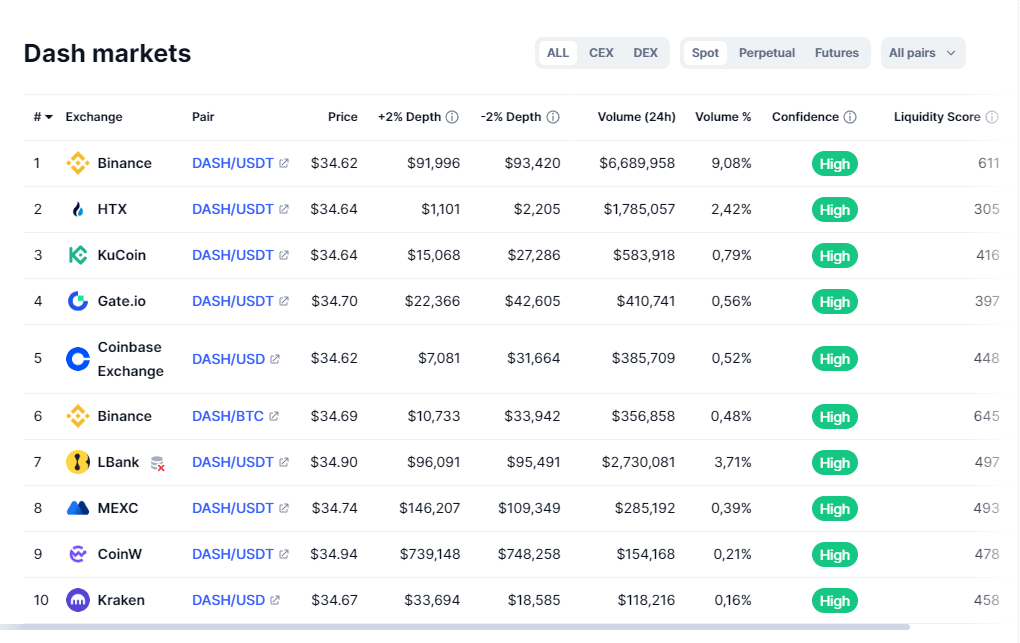 На сегодняшний день токен поддерживается всеми мировыми криптобиржами, поэтому провести покупку на рынке, либо найти более сложный инструментарий с повышенной доходностью, например, деривативы на базе указанной монеты, не составит труда. Ниже показано, сколько стоит пара DASH/USDT на нескольких ведущих платформах. Из приведенного можно сделать вывод, что вопрос, где купить нужный цифровой актив может быть решен достаточно оперативно.
