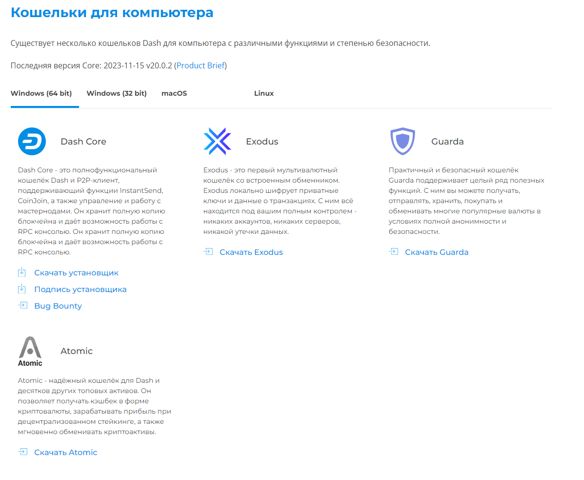 Разработчики дают посетителям сайта право выбора между официальным клиентом, который по умолчанию поддерживает весь самый современный функционал блокчейна, включая работу с мастернодами, а также рекомендуемыми к применению сторонними программами: