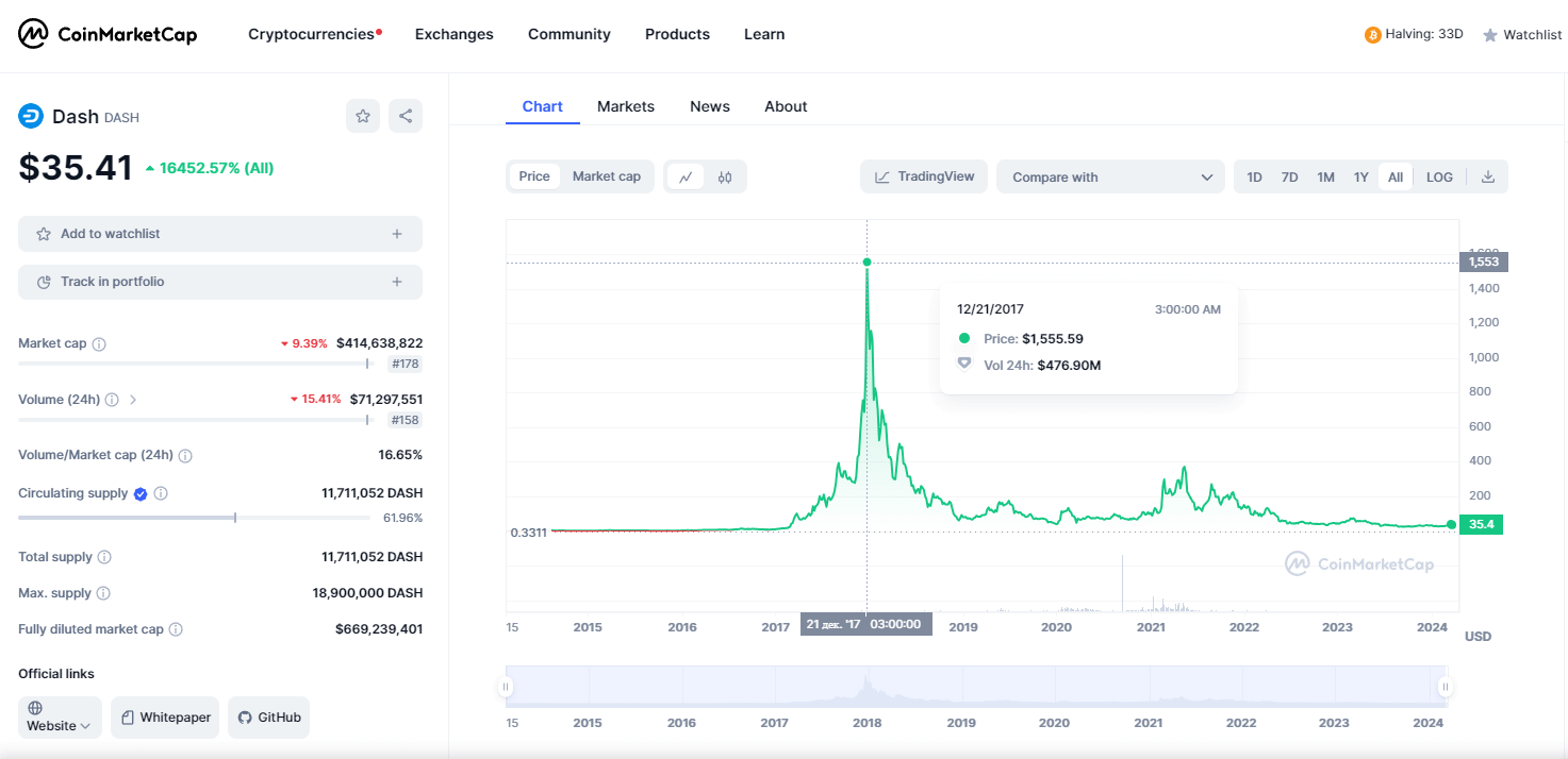 С момента своего появления рыночный курс токена успел молниеносно вырасти, а затем так же быстро упасть. На максимумах 2017 года 1 токен оценивался в 1555$. Ниже приведен график Tradingview на ведущем крипторесурсе CoinMarketCap.