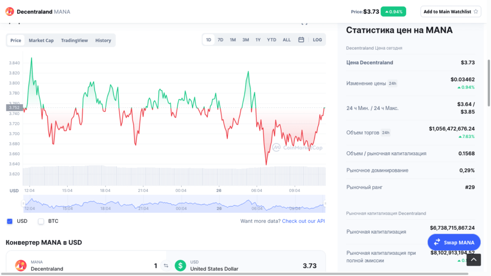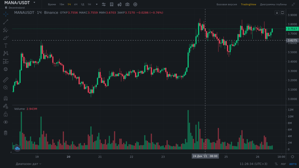 Стартовав в 2016 году, платформа успела превратиться в успешную коммерческую разработку. На момент публикации материала в конце 2021 года стоимость единицы составляла 3,73 к доллару (цена в рублях, соответственно, 275р по действовавшему курсу), показывая высокую доходность для средне- и долгосрочных вложений. То, сколько стоит отдельная единица открывает широкие возможности, чтобы купить и выгодно продать больших объемов токенов внутри дня, многочисленные отзывы покупателей подтверждают прибыльность подобных операций. Ниже представлен часовой график Mana/USDT на бирже Binance в Tradingview. Торговля также ведется и на других крупных площадках, в том числе Bitfinex.
