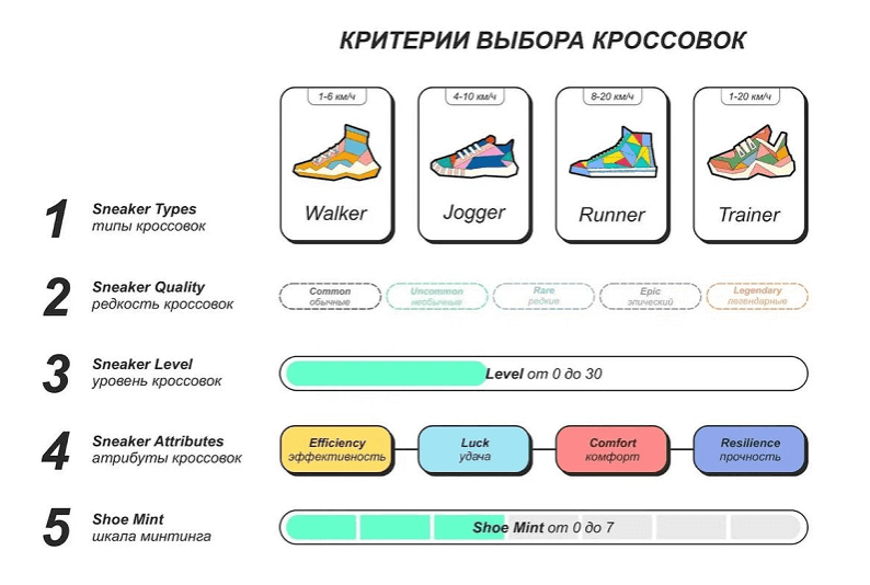 Выше представлено описание предлагаемого модельного рядя и основных характеристик отдельных лотов. Основной параметр – скорость передвижения. В алгоритме каждой модели заложены не только скорость генерации новых токенов, но и такие атрибуты как комфорт, прочность, удача и эффективность (о них расскажем далее). В зависимости от частоты и интенсивности практикуемых тренировок соответствующие характеристики изменяются.