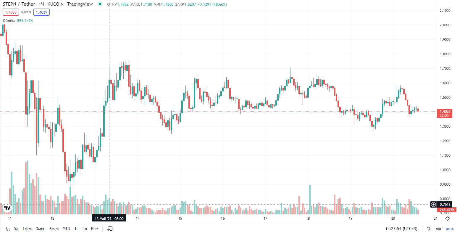 Запуск платформы произошел в первом квартале 2022 года, а уже к середине второго более полумиллиона активных пользователей были подписаны на аккаунт разработчиков в Twitter. Исходя из потенциала и масштабов расширения первой фитнес-вселенной, прогноз на 2025 год позволяет говорить о многократном росте курса к текущим котировкам, в том числе и цены в рублях, которые за счет низкого курса легко просчитывать на калькуляторе. На момент публикации актуальная стоимость 1 токена GMT по отношению к USDT зафиксировалась на уровне 1,4. Далее представлен актуальный график в Tradingview, на максимуме тикер достигал отметки в 4,4 (с учетом взрывного роста во многих отзывах покупателей отмечалось, как заработать на эмиссии быстро и много). Значит к представленным выше ценам сохраняется существенный потенциал роста. А с учетом доступной цены в рублях трейдеры могут купить в свой портфель за небольшую стоимость высокоперспективный актив. Провести сделку с контрактом можно на всех современных биржах, в том числе Binance, Kucoin и т.д.