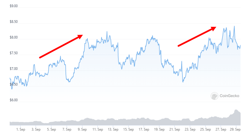 На данный момент криптовалюта стоит порядка 7,8$ с общей мировой капитализацией в 3 миллиарда долларов, что равняется 175 миллиардов рублей. А ежедневные торги проходят на сумму в 600 – 700 миллионов долларов. Отследить все показатели можно на сайте Tradingview.