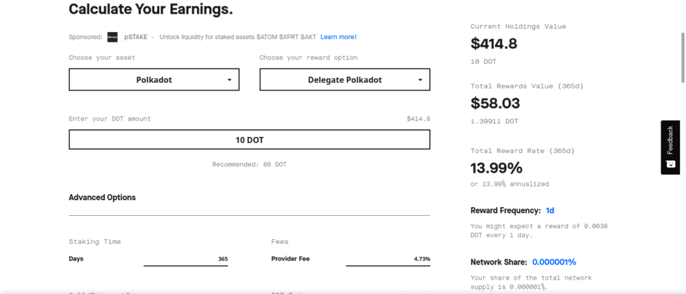 На старте проекта стейкинга, разработчиками было выявлено несколько критических ошибок и процедура перешла в статус заморозки. Это происходило в ситуациях с большим количеством валидаторов (более 22,5 тысяч) и стейкинге более 40DOT в одном пуле, поэтому временно действовали подобные лимиты для всех единиц валидации. На настоящий момент вопрос с появлением ошибок решен, и на специализированных сайтах каждый владелец DOT может примерно просчитать возможный профит от стейкинга, для его начала необходимо скачать программу-кошелек, поддерживающую функционал выбора кранов. В ней же можно будет решить вопрос как выводить имеющуюся сумму в фиат. Ниже представлен пример расчета в калькуляторе для 10DOT. Заморозив эту сумму в стейк-пуле, по истечению года номинатор сможет получить $58,03 или $0,15 в день. То есть, вложив $414 долларов по текущему курсу получить примерно 15% профита в год. Для пассивного способа дохода предлагаемый уровень представляет собой весьма интересное значение, значительно выше предлагаемых ставок по банковским вкладам.