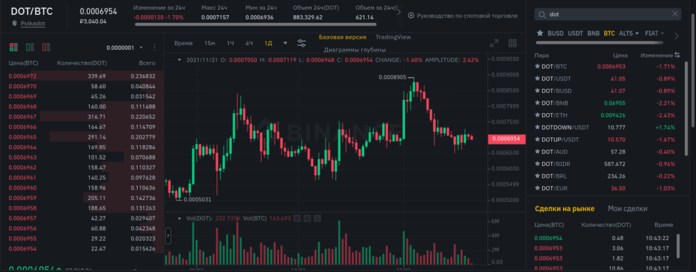 Купить токены можно на множестве криптовалютных бирж, в том числе и таких крупных, как Bitfinex, все современные площадки уже предлагают свободную куплю-продажу или обмен DOT с другими монетами. Ниже представлен дневной график на бирже Binance в представлении Tradingview по отношению к биткоину. Как можно видеть из окна активов справа от графика, токены DOT торгуются во многих парах с другими криптомонетами.