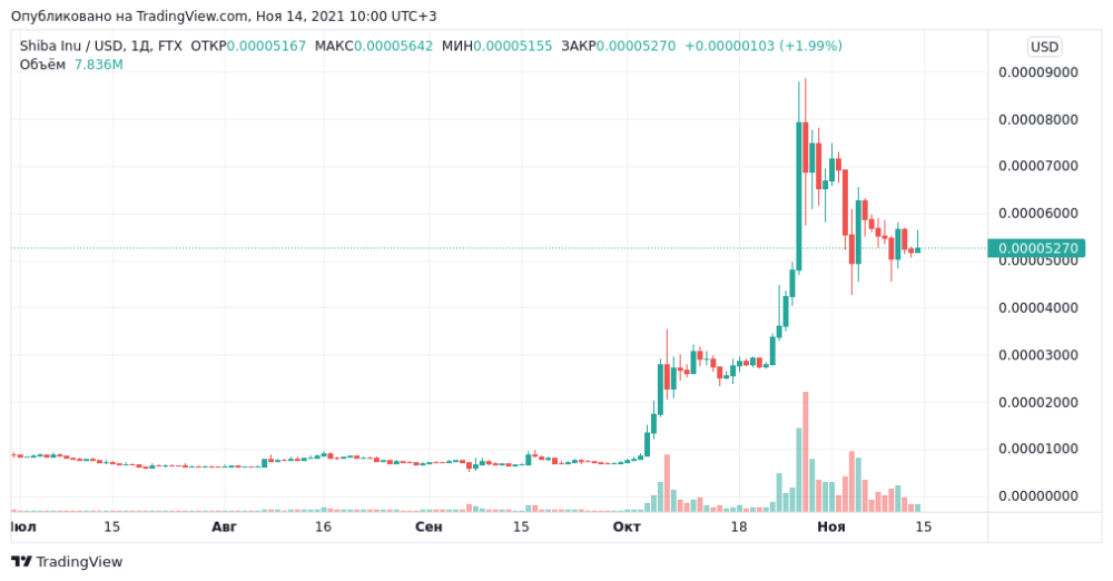 В июле 2021 года разработчики осуществили запуск собственной биржи, на которой возможен децентрализованный обмен многих криптоактивов между собой. Это дает возможность строить позитивные прогнозы на 2022 год, с хорошими перспективами поступательного роста и заработке на внутридневных колебаниях. Все объясняется довольно просто — высокий интерес обеспечивает большие объемы торгов, за счет чего изменения получаются более сглаженными и прогнозируемыми. На сегодняшний день курс на Binance и Bitfinex к доллару составляет 0.00005266 или 0,0038 к рублю. Это открывает каждому трейдеру даже с небольшим объемом депозита возможность стать Shiba-миллионером. Ниже представлен актуальный на дату создания статьи график в Tradingview. После долгой консолидации началась стадия активного роста и в данный момент закрепился на определенном уровне, с мощной поддержкой.