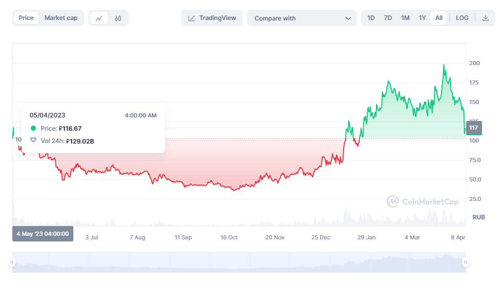 По информации CoinMarketCap, первые торги прошли в марте 2023 года, за это время токен, стартовав с курса в 102,6р (цена в рублях по актуальному на 12 апреля 2024 года курсу, в долларах – 1,22$) за монету, успел потерять в цене до 34,5р (абсолютный минимум на графике Tradingview ниже) и протестировать максимум в 203,49р. Индекс цен остается в указанных границах и по настоящее время.