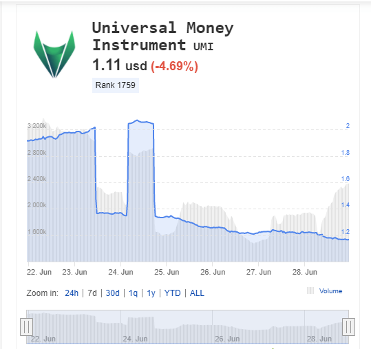 - Курсовая стоимость на текущий момент составляет 1. 11 USD за одну монету. График, на котором отображен текущий курс — прилагается на скрине. Причем Криптовалюта UMI не обращается на традиционных криптовалютных биржах. Она котируется на специальной торговой площадке https://sigen.pro . Это обусловлено тем, что как заявляют разработчики — UMI не является стейблкоином и фактически не привязывается к курсу фиатных валют в принципе. Чтобы узнать — сколько стоит та или иная монета, можно воспользоваться такими информационными ресурсами как, например, CoinDesk