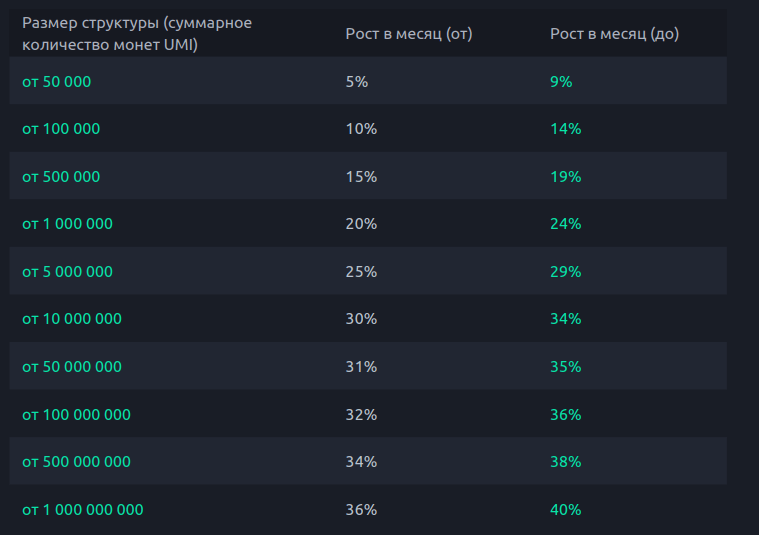 Вариант первый — это покупка монеты (минимальная сумма должна быть на счету – 20 UMI) и размещение ее на одном из кошельков проекта. Далее свои активы пользователь может присоединить к монетному пулу других участников. Общее количество монет в таком пуле должно быть не менее 50 000. Как только будет собран такой пул — на счета его участников начисляется пассивный доход. Причем, можно самому начать создавать такую структуру, за что выплачивается дополнительное вознаграждение. Организаторы структур получают на свой адрес от 1% (минимум) до 5% (максимум) в месяц от стейкинга всей своей структуры.