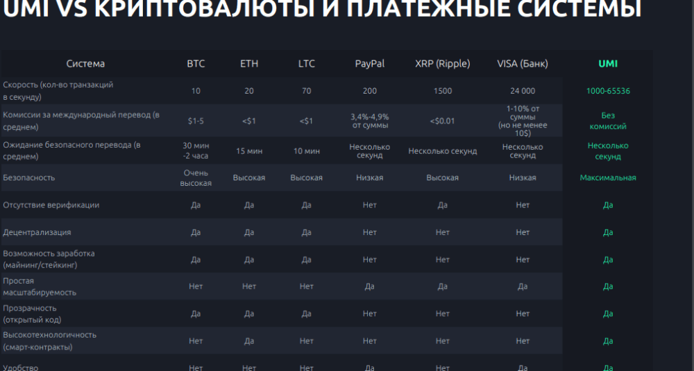 Основная легенда разработчиков крипто монеты UMI базируется на следующих заявленных ими преимуществах и особенностях проекта: