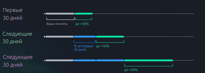 - Каждому пользователю гарантируется ежемесячный пассивный доход до 40 % за счет использования инновационной формы майнинга криптовалюты – стейкинга. Все монеты пользователя объединяются в монетные пулы, за счет привлечения все новых и новых участников. Собранные в такие пулы активы клиентов генерируют новую стоимость за счет увеличения количества монет, роста их курсовой стоимости, расширения самой сети. Увеличение числа нодов — узловых точек в общей системе блокчейн