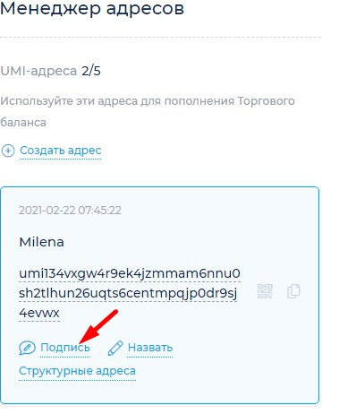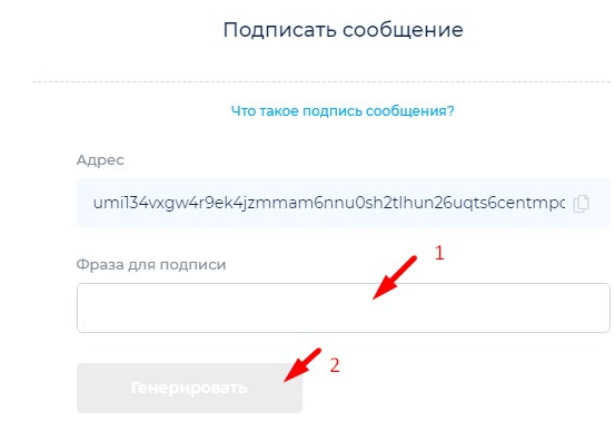 Для выполнения этой операции нужно ввести адрес UMI-кошелька , а также специальную подпись, которая делается на сайте Sigen.pro.