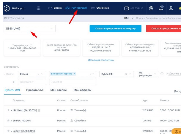 Для этого в своем личном кабинете на бирже SIGEN необходимо зайти в меню «Р2Р». Далее следуя указанным там инструкциям приобрести нужное количество монет (напомним – их должно быть не менее 20). Здесь нужно помнить — цена криптовалют в обменниках, так же как и на биржах, меняется, каждую минуту. Чтобы выбрать лучший курс для покупки крипты рекомендуется предварительно внимательно почитать отзывы покупателей по каждому из продавцов.