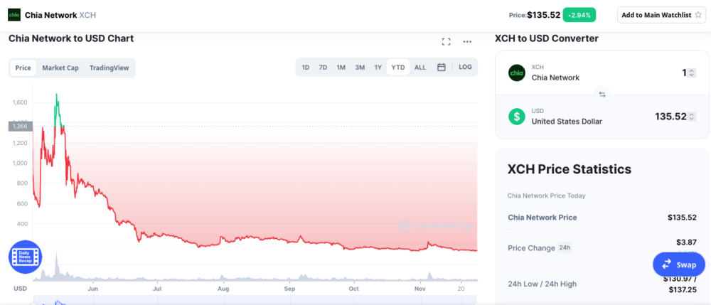 Новая технология заинтересовала криптоинвесторов, которые вложили в ее развитие многие венчурные миллионы. «Дорожная карта» увидела свет к февралю 2021 года, а с мая были запущены транзакции. За этот период монета успела вырасти со стартовой цены в $834, которая была действительна на 5 марта текущего года до $1600 на пике 15 мая. После этого вместе с остальным рынком криптовалюта XCH пережила падение, на момент написания статьи справедливая рыночная стоимость находилась на уровне в $135 (цена в рублях — примерно 9990р за монету). Ниже представлен Tradingview график этой китайской криптовалюты за все время торгов на бирже.