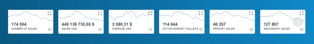 На портале Nonfungible.com, наиболее авторитетном ресурсе своего сегмента, приводится следующая статистика по рынку (на момент написания материала графики показывали снижение, но оно по большей части связано с изменением стоимости базовых криптовалют).
