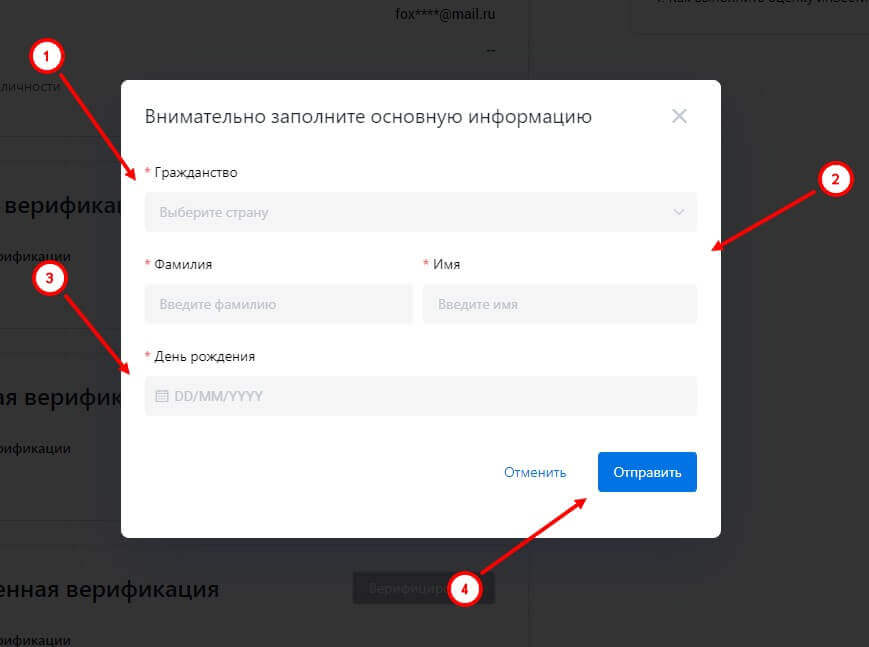 Откроется окно, где нужно указать гражданство, фамилию и имя и дату рождения, после чего нажать на кнопку “Отправить”.