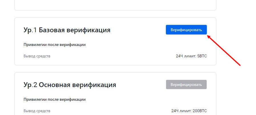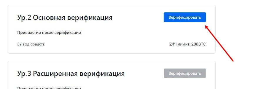 Чтобы пройти второй уровень, рядом с “Ур.2. Основная верификация” нажмите также на кнопку “Верифицировать”.