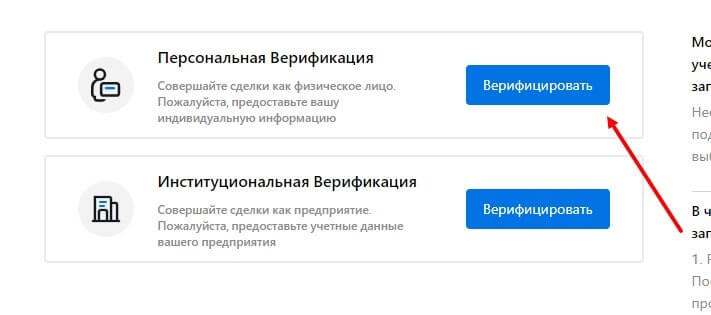 Затем выберите тип верификации: персональная, если аккаунт будет использовать частным лицом или институциональная для организаций. В нашем случае нужно выбрать “Верификация” рядом с пунктом “Персональная верификация”.