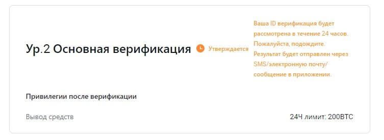 После отправки данных верификация будет пройдена и пользователь получит дополнительные привилегии: откроются криптозаймы с залогом, вывод до 5 BTC в сутки, доступ к спотовой и деривативной торговле и многим другим преимуществам.