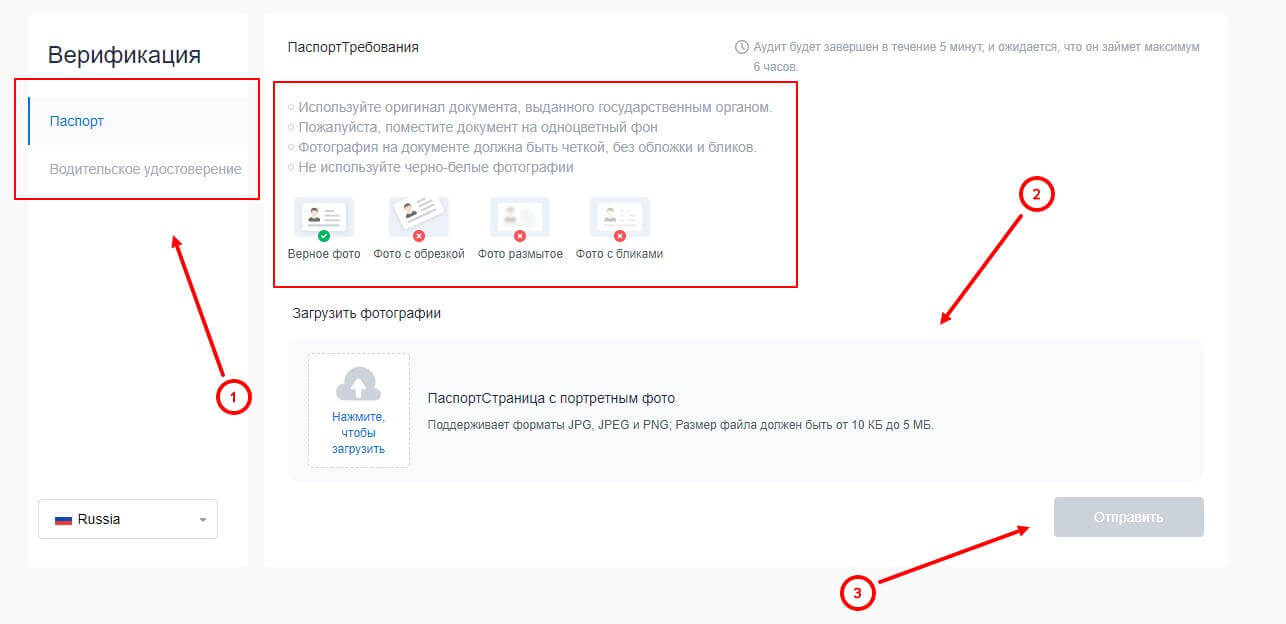 Затем появится страница, где нужно загрузить документы. Выберите тип документа (паспорт или водительское удостоверение), выберите документ и нажмите на кнопку “отправить”. Учитывайте требования, указанные выше формы загрузки документов (отметили красным квадратом).