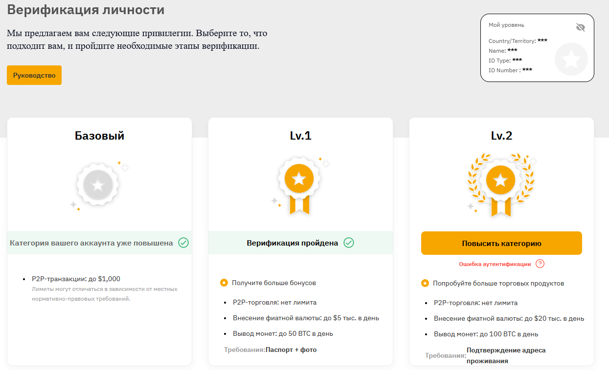 - Уровень 1. Полностью снимает верхние границы для P2P, увеличивает до $5000 в день планку внесения на счет и вывод до 50BTC.